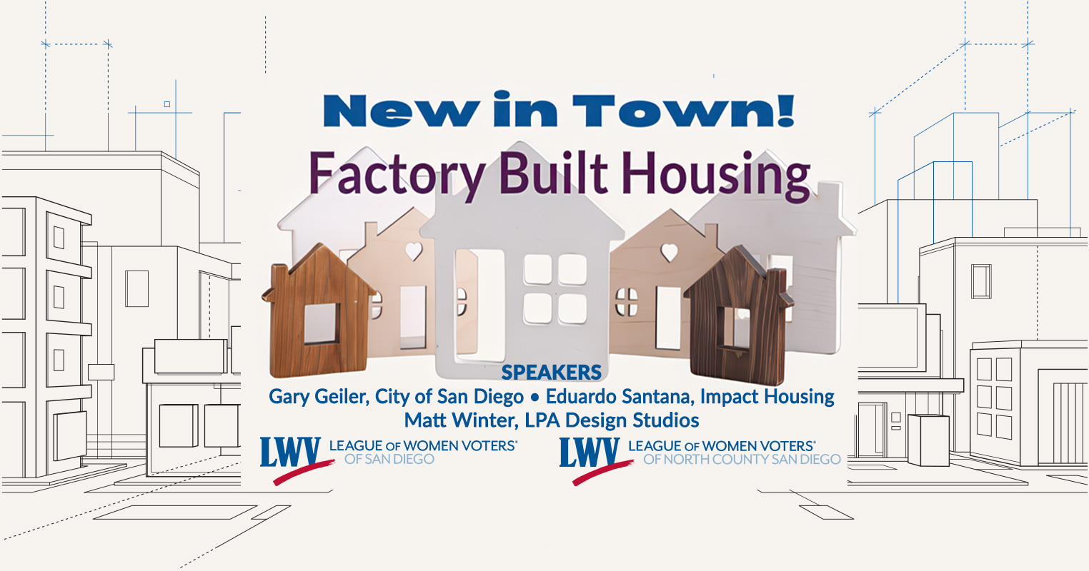 Factory-built housing is an alternative to the traditional stick built method that has been used for many years. Sometimes called modular housing, it offers potential for significantly reducing housing costs. It can be built much more quickly than traditional housing. The webinar is a followup to the February 25th webinar on housing, but can be seen alone as well. The speakers will explore what the San Diego is doing to facilitate factory built housing and show examples of actual factory built projects in San Diego.